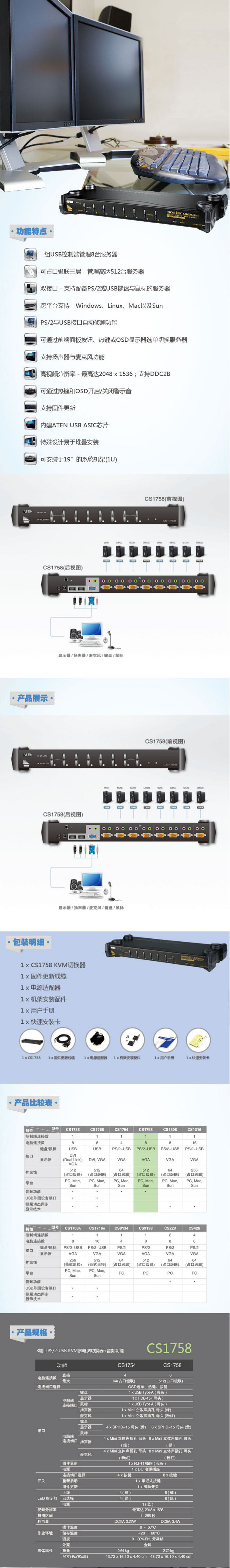 Aten/Hongzheng CS1758 8 -мгновенный USB/PS2 смешанный VGA Rack Scult 1920*1080