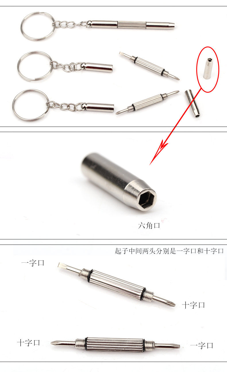 [使用备注说明:十字口小螺丝基本上都能用,一字头槽口1.5mm以上能用,1.5mm以下不可用,][内六角套筒:2.6mm可用,其他规格不能用。][(单买自用者请注意:此款螺丝刀不一定适合拧所有的眼镜螺丝----眼镜螺丝型号大小松紧繁多。无框眼镜建议购买小店另一款四用螺丝刀:][https://item.taobao.com/item.htm?spm=686.1000925.0.0.oRmrft]&id=531717493906[)]