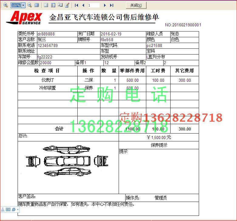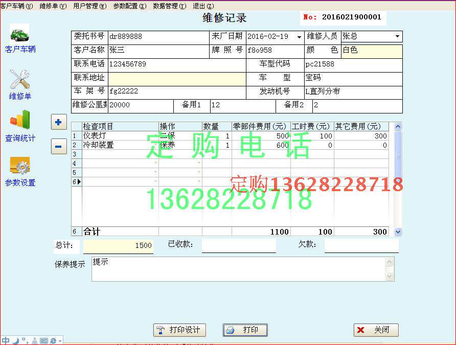 4S Automotive After -Sales Software Software Software Введение] Автомобильная система управления обслуживанием.Программное обеспечение содержит информацию о клиентах и записях обслуживания.И информация о входе в систему пользователя, управление страховой компанией, управление моделью автомобилей, резервное копирование данных, функция восстановления данных.Вы можете запросить данные в любое время, вы можете увидеть дебиторскую задолженность, неоплачиваемый платеж и получение платежа.Это специальное программное обеспечение для компании по обслуживанию ATHES -SALES, мотоцикле после технического обслуживания.