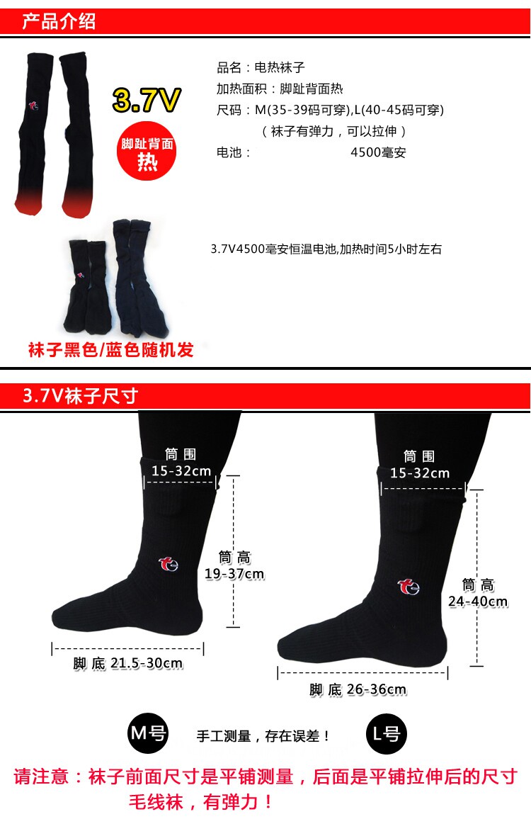 3,7 В литиевые батареи электрические носки, шерстяные растяжки, м/л по размеру, синий и черный цвет, необходимо отметить, не отмечайте случайный цвет волос.Носки оснащены постоянной температурной батареей, а температура нагрева при нормальной температуре составляет около 45 градусов. Носки упругие.Мужчины выбирают L, леди выбирайте М. Зарядка сначала, а затем носите его.
