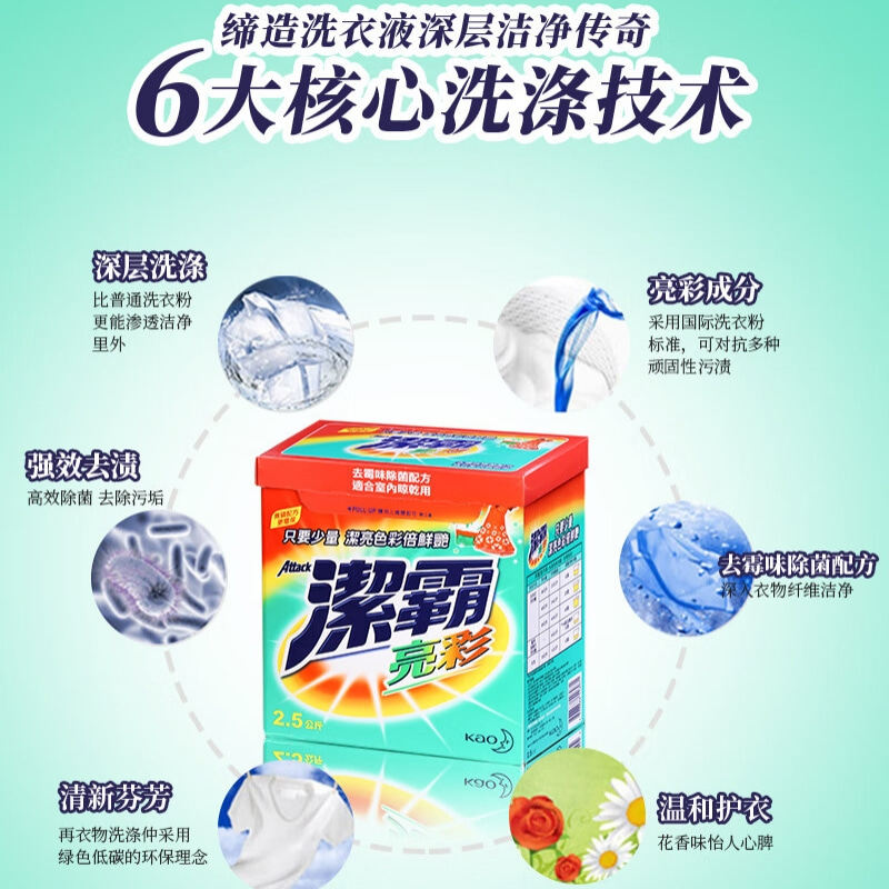 Гонконгская версия стирального порошка Kao Jieba Bright Color 2,5 кг, яркие цвета в два раза ярче, плесень и стерилизация, формула без фосфора