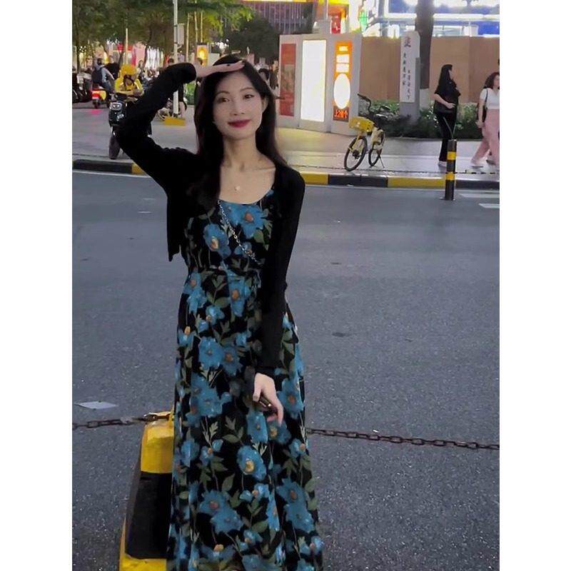 Осенняя весенняя длинная юбка, платье, комплект, европейский стиль, цветочный принт