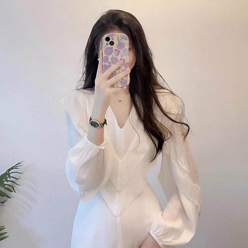 Осенняя длинная юбка, белый лонгслив, платье, европейский стиль, коллекция 2023, французский стиль, изысканный стиль, яркий броский стиль, по фигуре