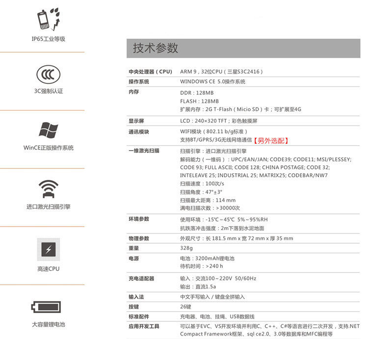 Конфигурация: одно -мерное сканирование лазерного штрих -кода+Wi -Fi+Bluetooth Transmission+подлинная система CE5.0