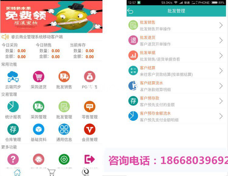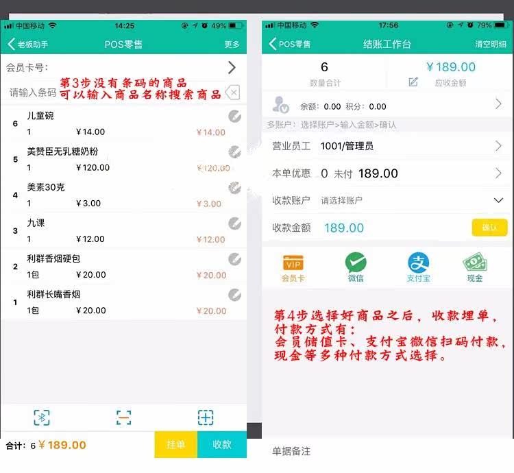 Мобильный телефон может добавить информацию о продукте и сканировать штрих -код продукта для продаж.
