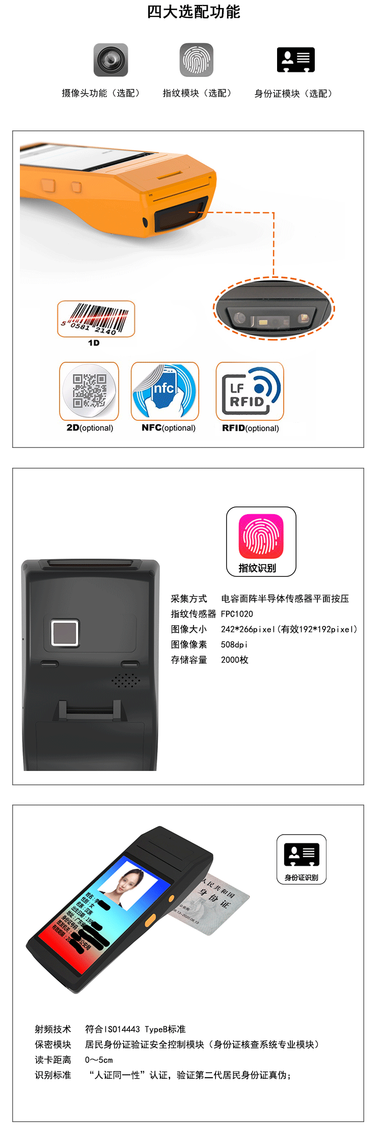 Необязательно: UHF Ультра-высокая частота, идентификация удостоверения личности, идентификация отпечатков пальцев, идентификация чиповой карты IC