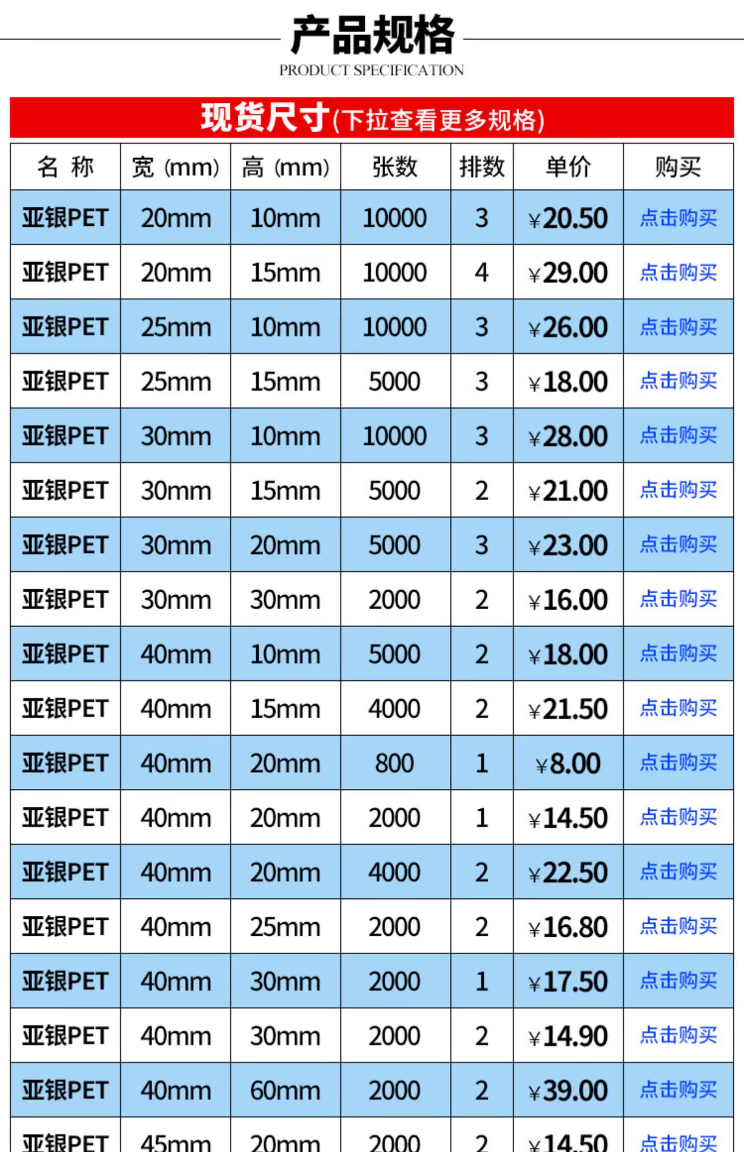 - [Водонепроницаемое азиатское серебро] 40*10*5000 лист/2 ряда