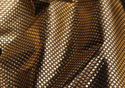 Он применяет металл в отражающем слое.Разрыв между разбросанными золотыми точками обеспечивает воздухопроницаемость ткани.