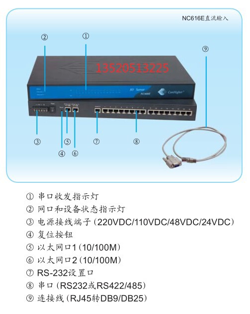 Canhigher Kanghai NC616E Двойной серийный сервер, 2 10 м/100 м адаптивная сетка, встроенная с электромагнитной изоляцией 1,5 кВ; 16 RS232 последовательный порт, график RJ45, каждый серийный порт с защитой 15 KvesD.220V Вход мощности переменного тока.