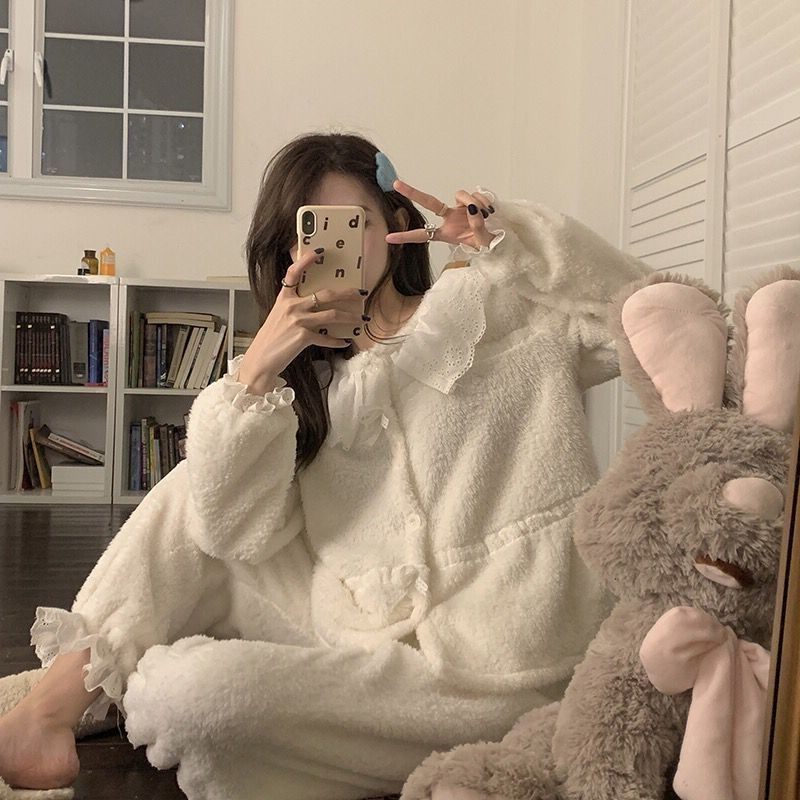 Флисовая зимняя коралловая пижама, бархатный демисезонный фланелевый милый кружевной комплект, увеличенная толщина