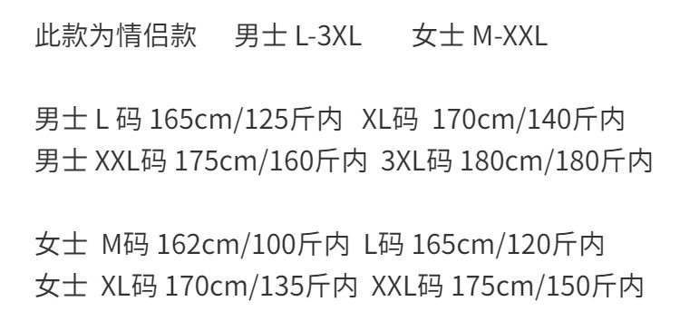 | Размер: | 3xl код [пожалуйста, обратитесь к странице сведений], M код [предложение 80-100 Catties], L код [предложение 100-110 Catties], XL Code [Предложение 110-130 Catties], XXL Code [Предложение 130-145 Catties] |