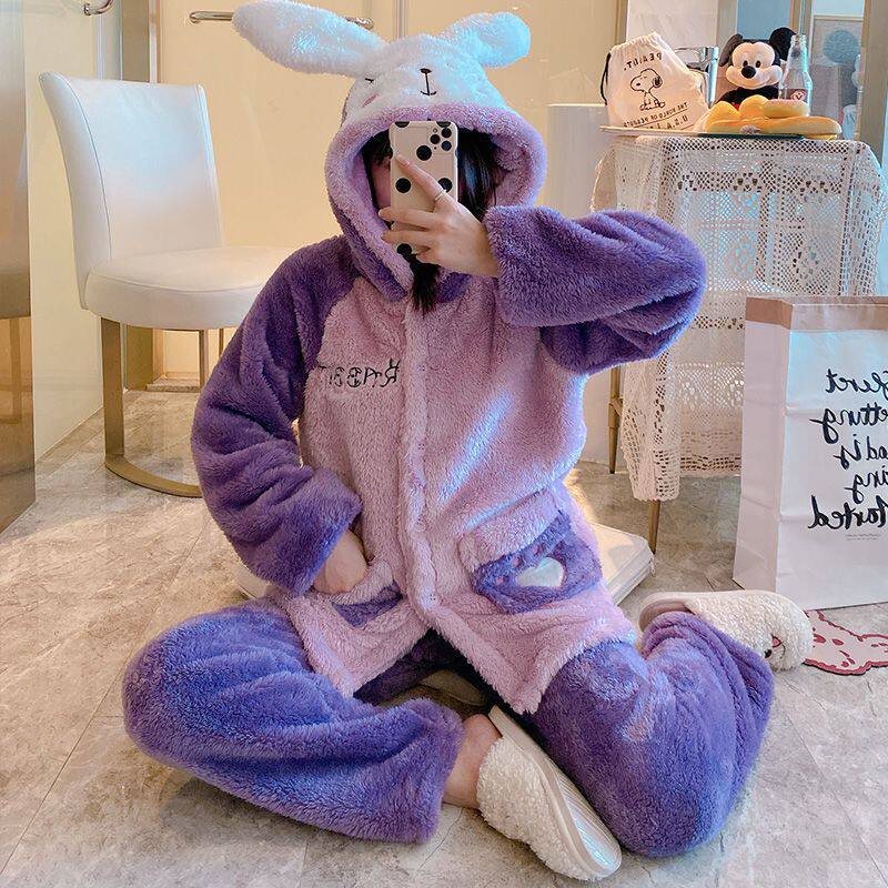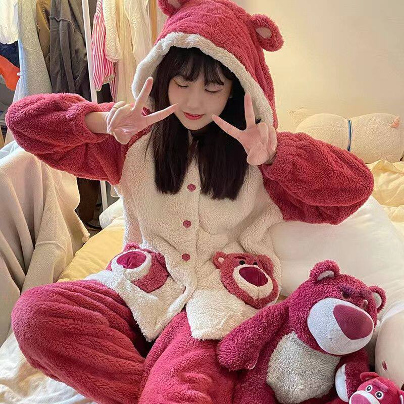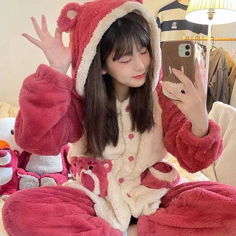 Коралловая бархатная зимняя утепленная милая удерживающая тепло пижама, брендовая клубника для школьников и студентов, комплект