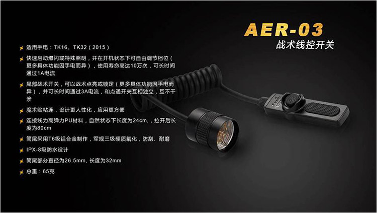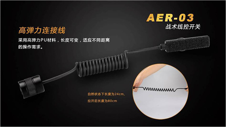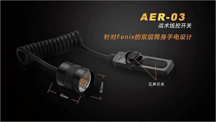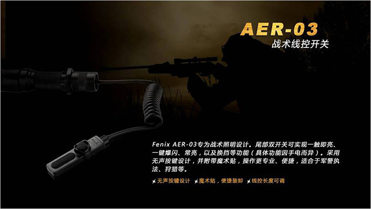 Fenix AER-03 предназначен для тактического освещения.Задний двойной переключатель может реализовать функции одного прикосновения, одного -щелчка, Changliang и смещение (конкретные функции, варьирующиеся от фонарика).Использование дизайна безмолвных кнопок, с магическими наклеек, более профессиональной и удобной операцией, подходящей для правоохранительных органов Jing, охоты и т. Д.