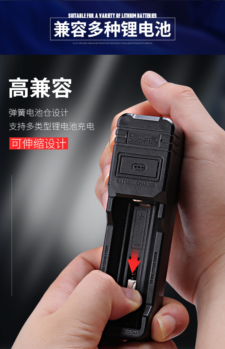 SUPFIRE SHENHUO SNITH LIGHT LIGHT FROWERLIGHT 26650 Зарядное устройство литиевого батареи 186,5 млн. Стоиков с двумя слотами зарядки с двумя слотами.