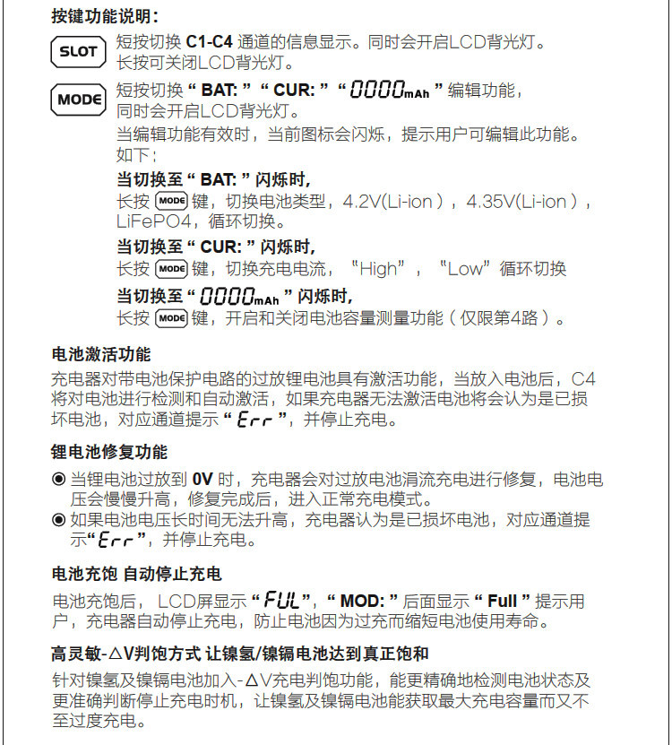 ·Существует два ключа, чтобы вручную переключить отображаемый слот зарядки и переключить различные параметры зарядки.