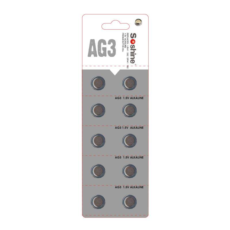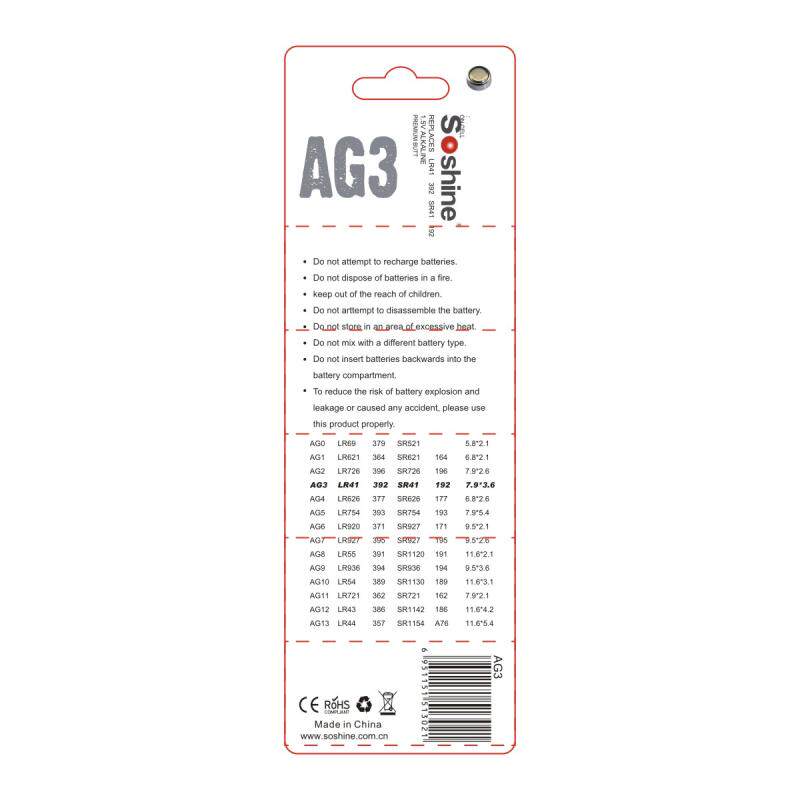 Soshine Ag3/LR41/392/SR41/192 Аккумулятор с щелочной пряжкой 1,5 В 28mah 10 карт