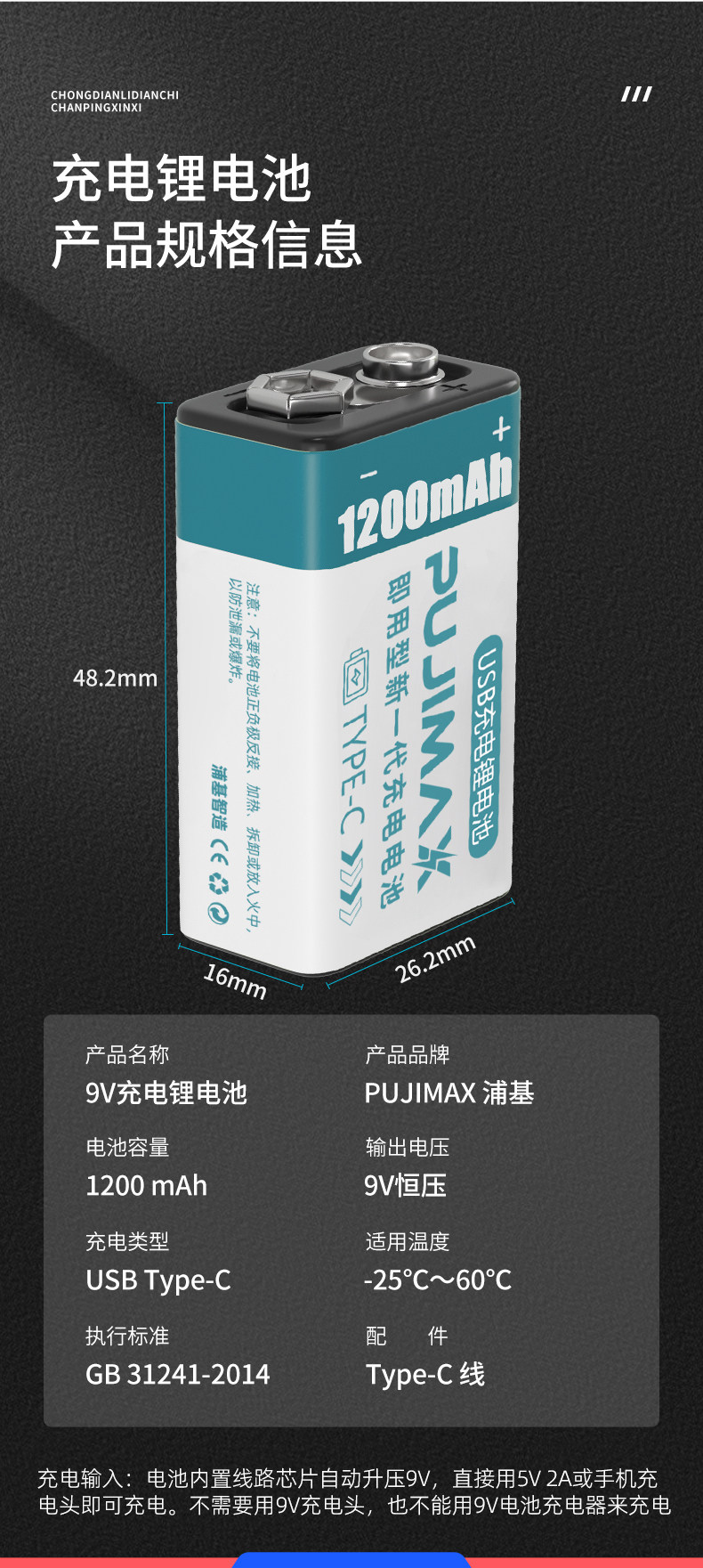 PUJIMAX Литиевые батарейки с зарядкой, 9v
