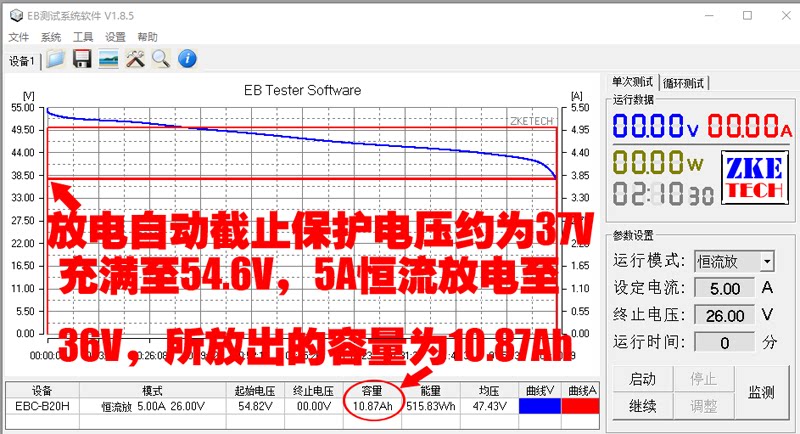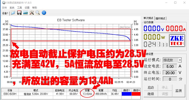 Тест на доску также является тестом.Обожжение Zhi EBC -B20H Тестирование тестеров (полное напряжение 42V 5A постоянное ток, выпуская напряжение защиты в тупике 28,5 В, выпущенная емкость 13,4AH)