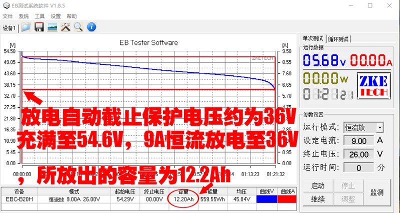 Тест на доску также является тестом.Сжигание ZHI EBC -B20H Тестирование тестеров (полное напряжение 54,6 В 9A. Выпуск постоянного тока, выпуская комбинированное напряжение защиты 36 В для высвобождения 12.2AH емкости)