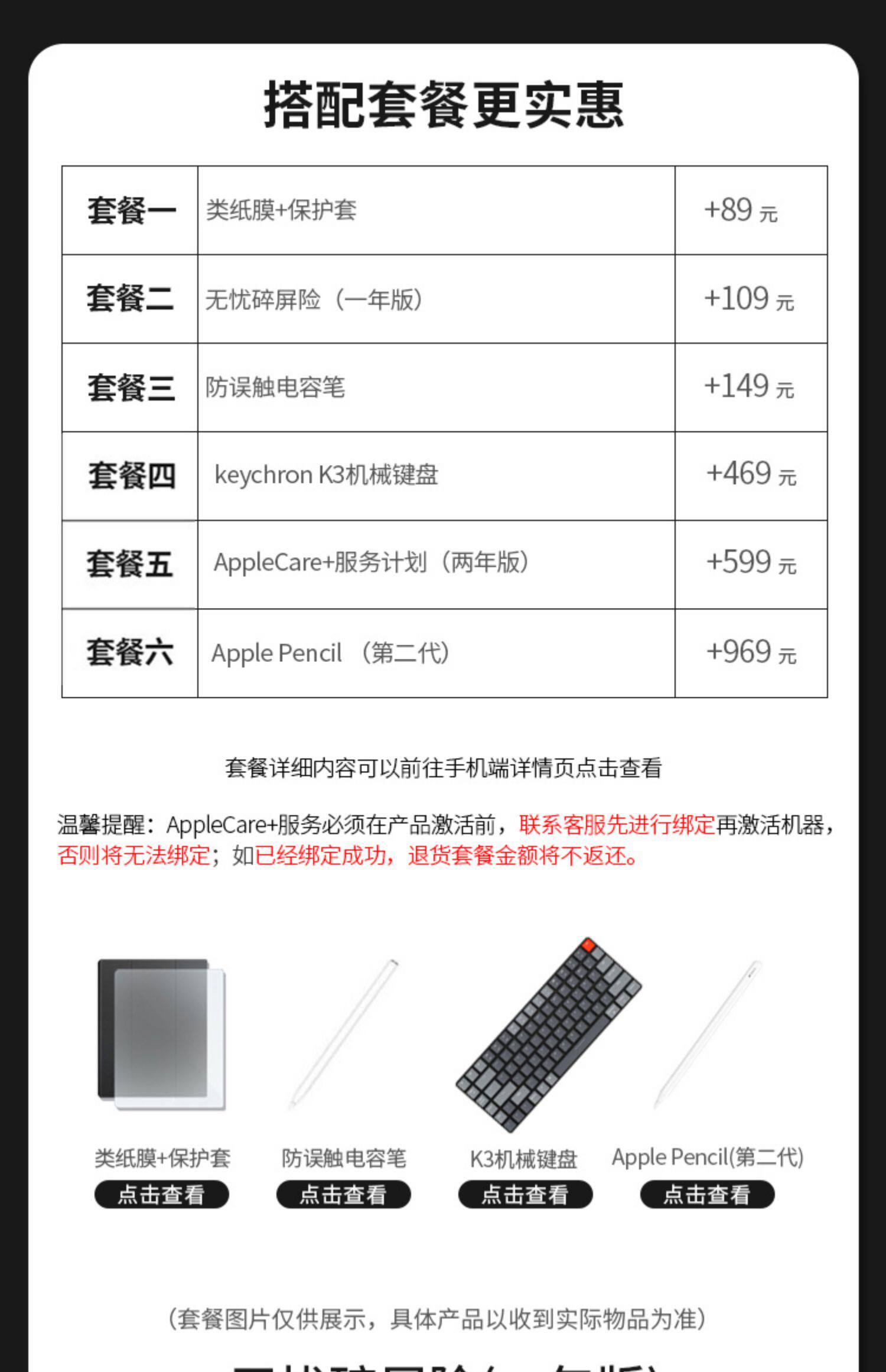 | Тип пакета: | Официальная стандартная конфигурация, Пакет 1: бумажная пленка+защитная обложка, Пакет 2: Страхование экрана -Беспокойство (версия на один год), Пакет 3: анти -эеррора -конденсатор, Пакет 4: Механическая клавиатура Keychron K3, Пакет 5: Apple Care+ план обслуживания, Пакет 6: Apple Pencil (второе поколение), Пакет Семь: 11 -дюймовый дюйм -дюйм |