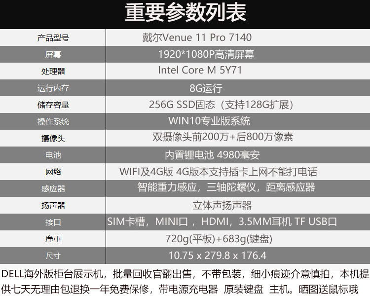 Dell Counte 11 Pro 7140 планшет компьютер Windows 10 System PC Notebook Two -In -One Wi -Fi WiFi