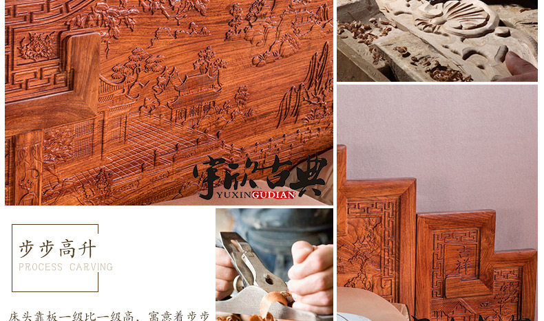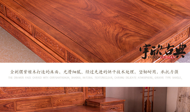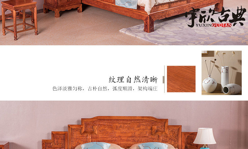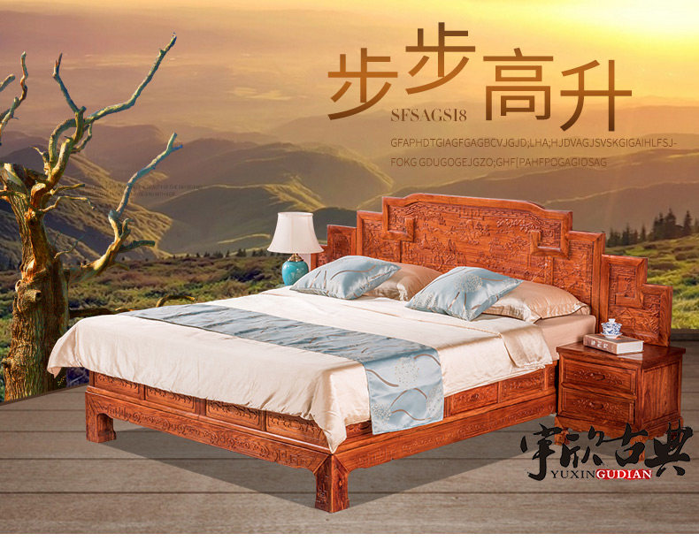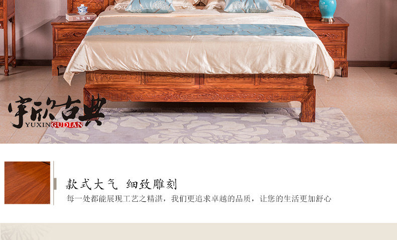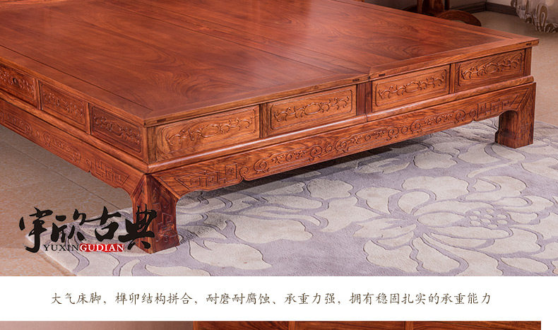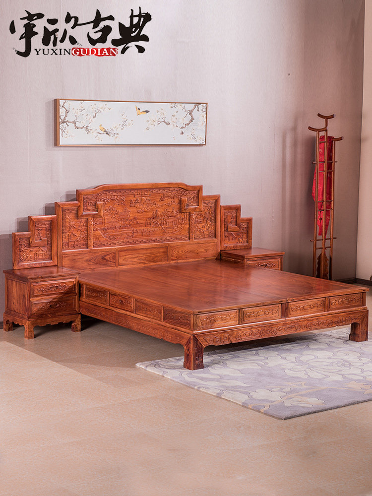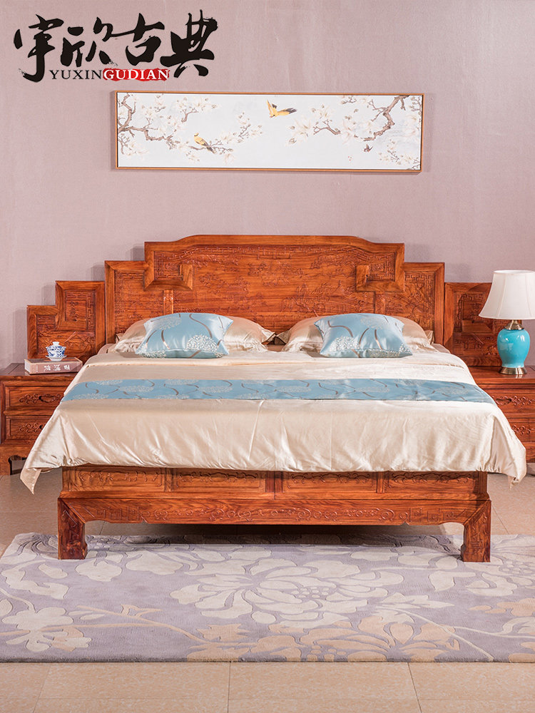 宇欣古典 Китайский стиль сплошной древесной кровать красное дерево, антикварная резная мебель для спальни с двуспальной кроватью YX304