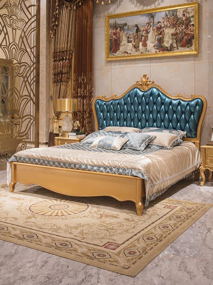 Европейская стиль двойная кожаная кровать простая главная спальня свадебная кровать настоящая деревянная кожаная кровать в высокую коробку высокую коробку высокий роскошный золотой цвет