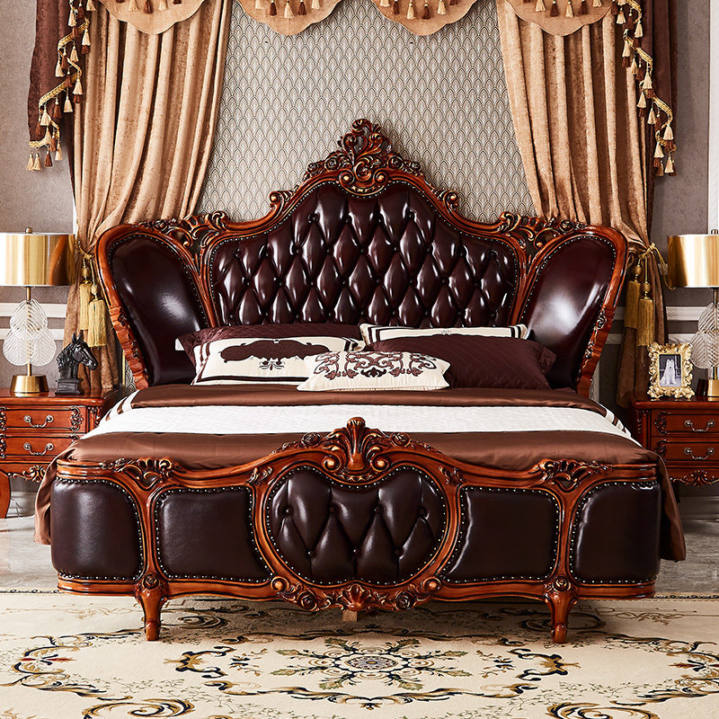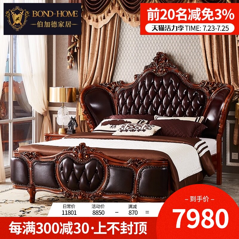 伯加德 Кожаная кровать американского стиля главная спальня 1,8 млн. Европейская стиль роскошная сплошная кровати с твердым деревом принцессы резной кровать