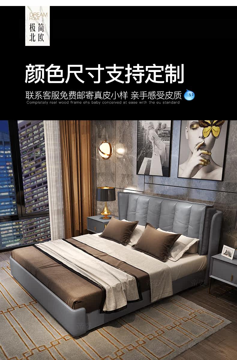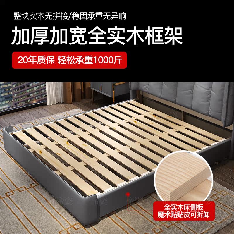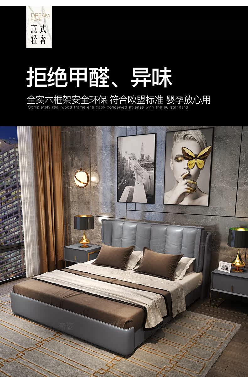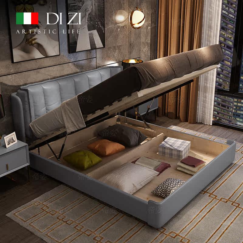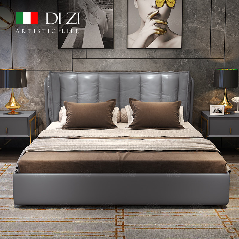 Кожаный прикроватный слой коровьи светильники роскошная главная спальня кровать 1,8 метра скандинавской вниз по нисходящей коробке -модерн двуспальная двуспальная кровать 2