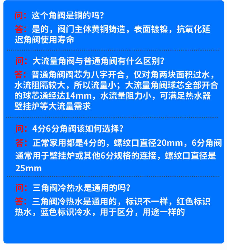 | Цвет: | 4 точки клапана треугольника холодной воды (синяя этикетка), 4 точки клапана треугольника горячей воды (красная метка), 6 -точкой треугольной клапаны холодной воды (зеленый стандарт), 6 баллов Клапан треугольника горячей воды (красная метка) |