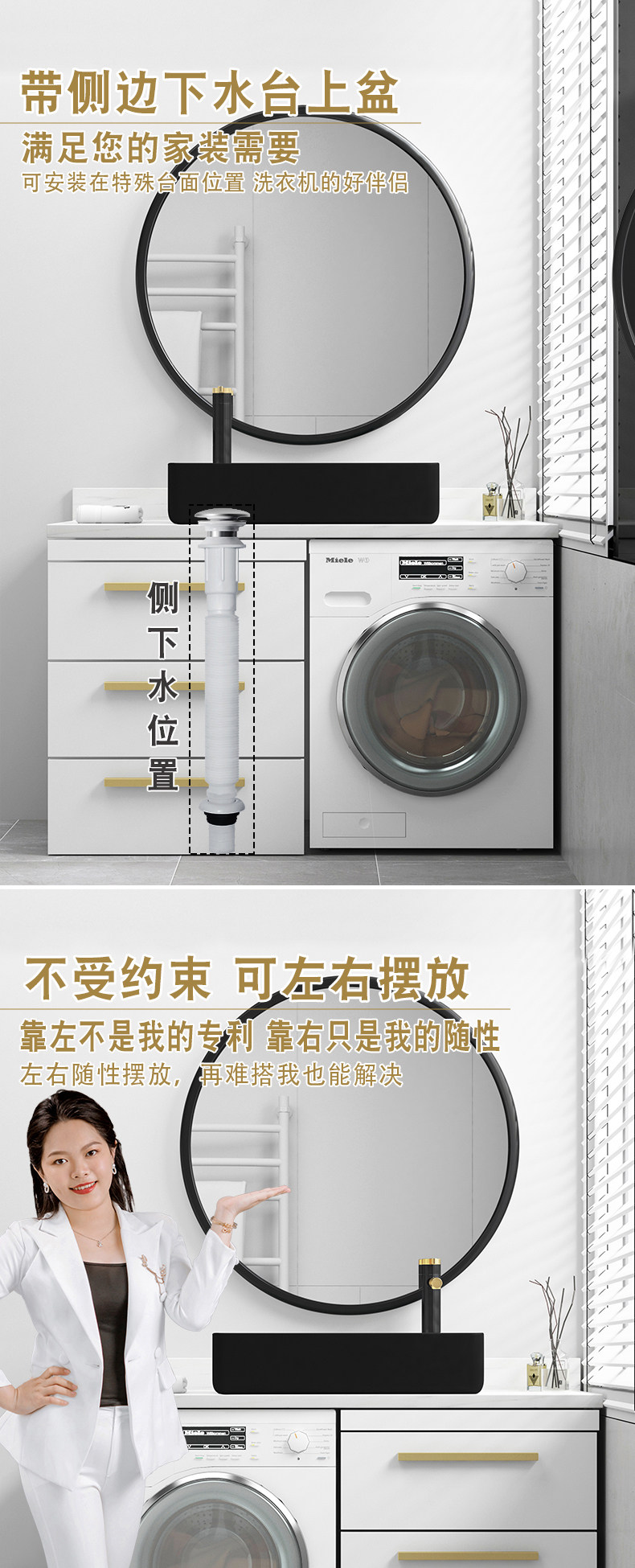Сторона черного бассейна для мытья рук на сцене частично удалена из стиральной машины для воды, чтобы контролировать левую и правую дренажную прачечную бассейн