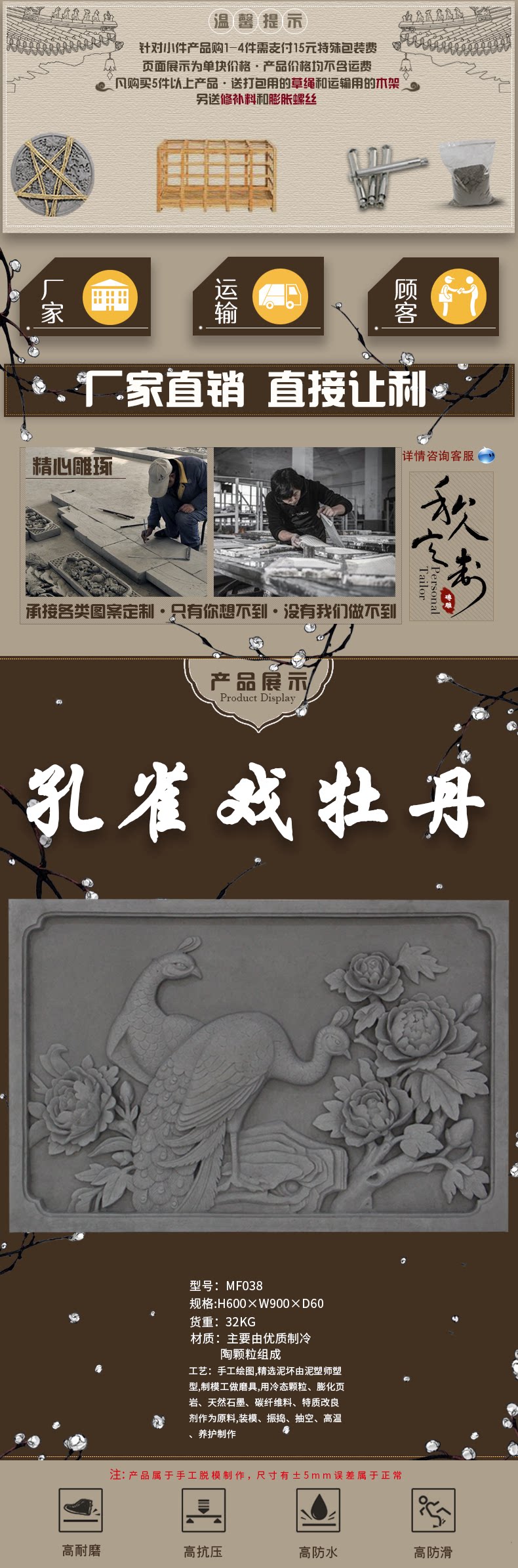 Кирпичная резьба павлина драма пион антикварный кирпич
