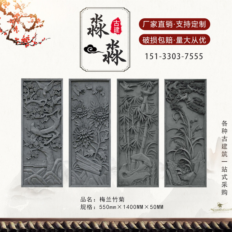 Антикварная вертикальная длинная сливовая орхидея бамбука из хризантема резьбы китайская внешняя стена Внешняя стена снятие
