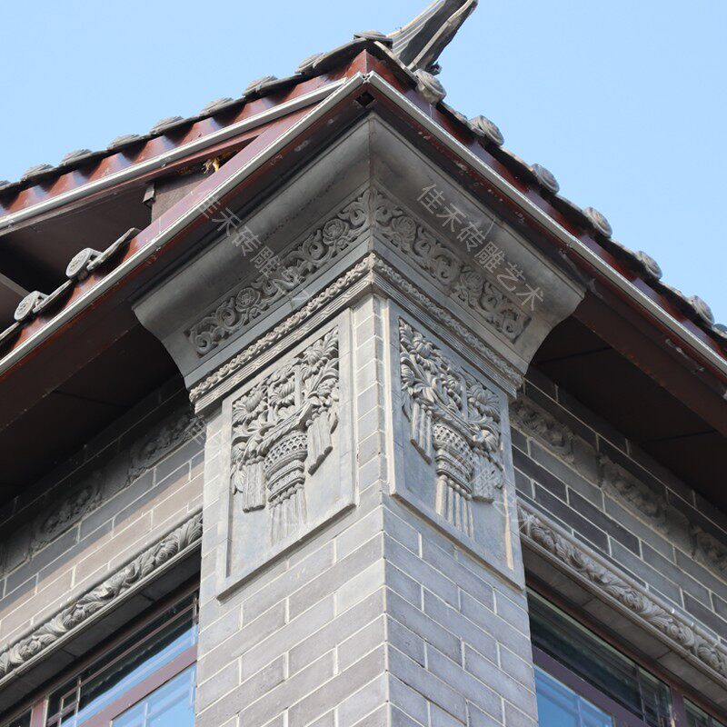 Резьба по кирпичу в китайском стиле, рельефы, карнизы, колонны, настенные украшения, древние ворота двора, резьба по синему кирпичу, фонари и цветы.