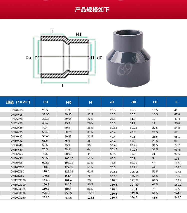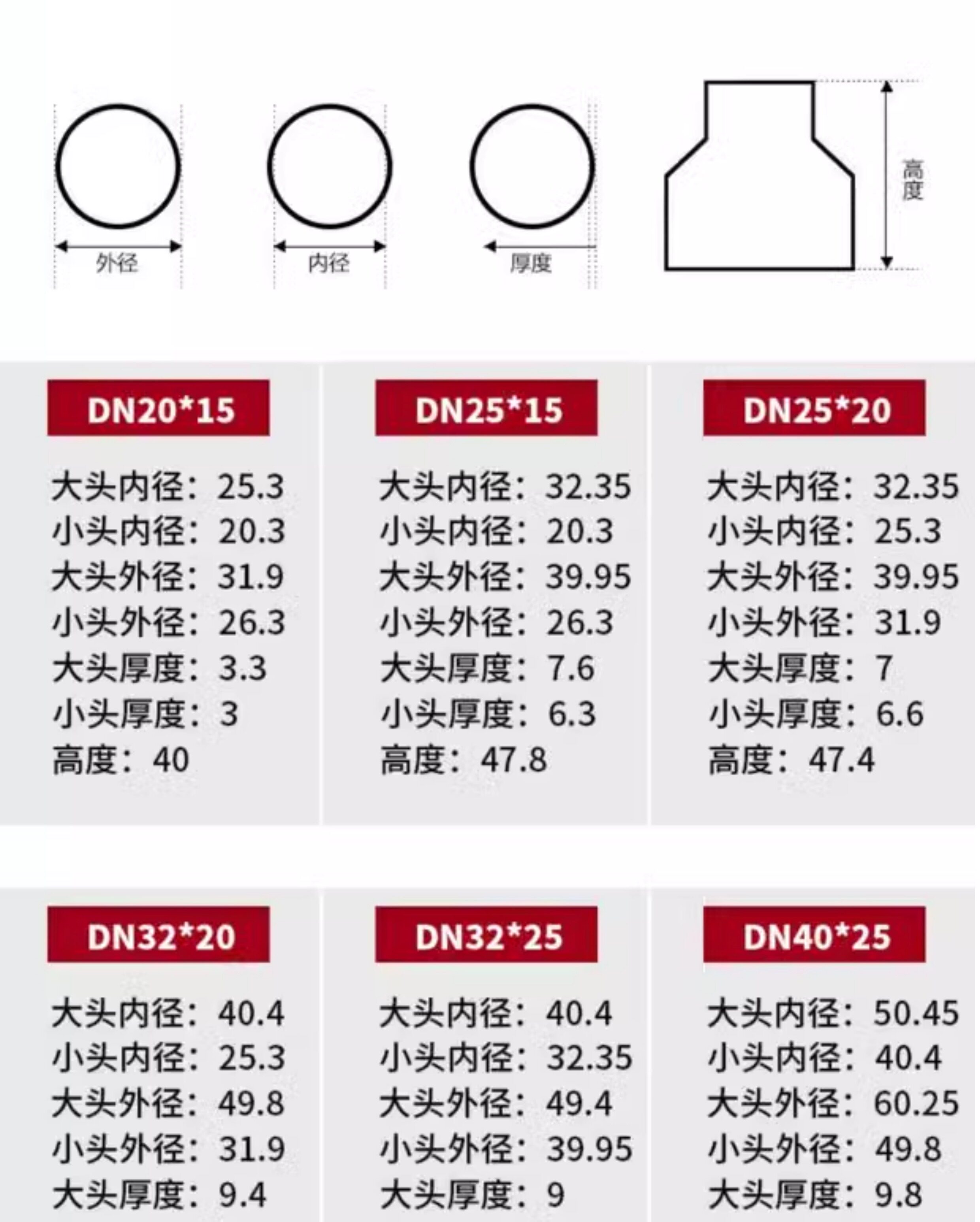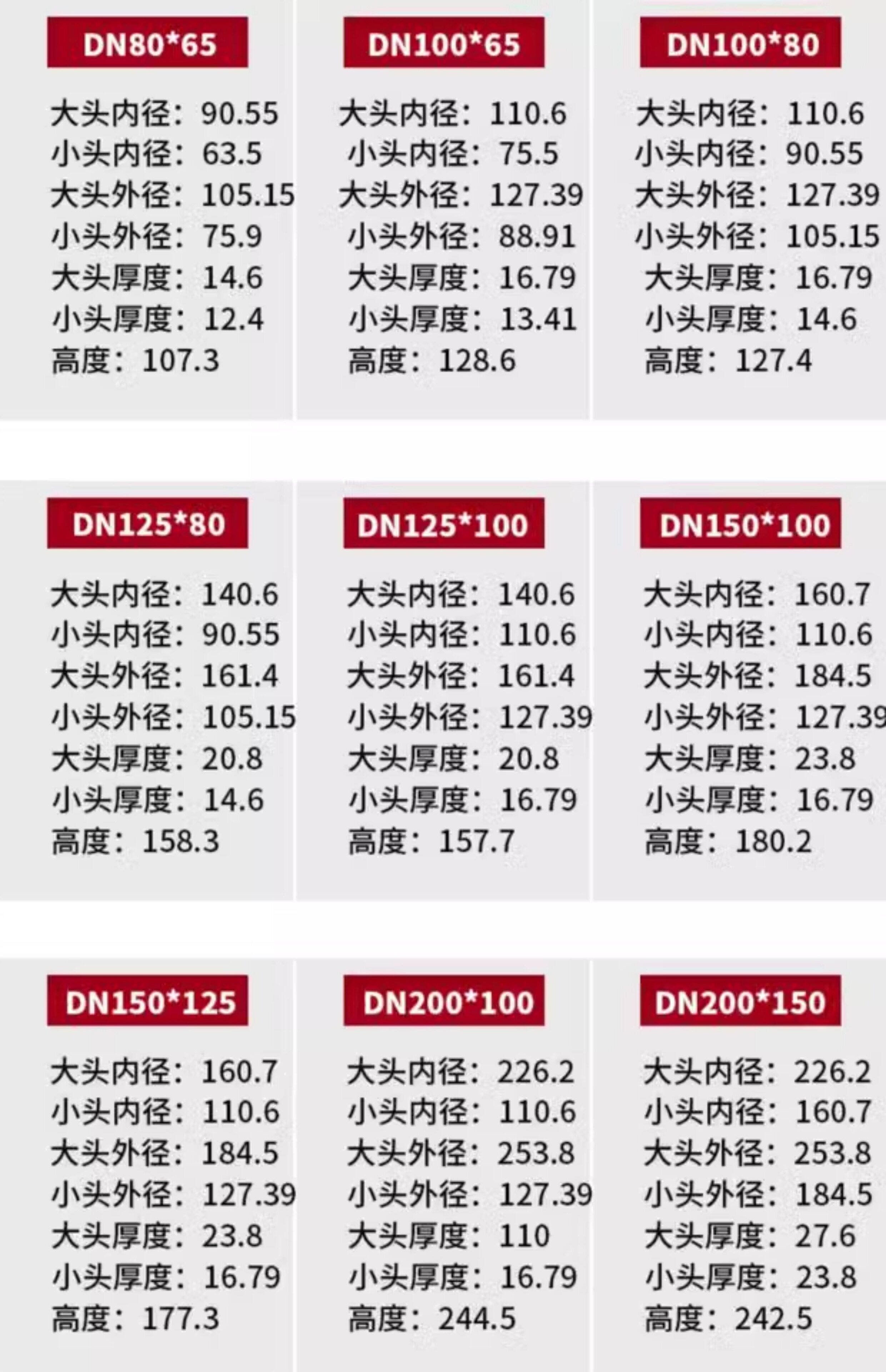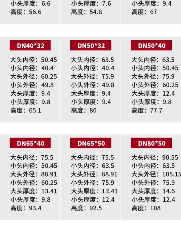 | Цвет: | DN20*15 (внутренний диаметр 25*20 мм), DN25*15 (внутренний диаметр 32*20 мм), DN25*20 (внутренний диаметр 32*25 мм), 32, 40, 20mm, 32, 40, 25mm, 32, 40, 32mm, DN40*15 (внутренний диаметр 50*20 мм), DN40*20 (внутренний диаметр 50*25 мм), DN40*25 (внутренний диаметр 50*32 мм), 40, 32, 40mm, DN50*15 (внутренний диаметр 63*20 мм), DN50*20 (внутренний диаметр 63*25 мм), DN50*25 (внутренний диаметр 63*32 мм), DN50*32 (внутренний диаметр 63*40 мм), DN50*40 (внутренний диаметр 63*50 мм), DN65*15 (внутренний диаметр 75*20 мм), DN65*20 (внутренний диаметр 75*25 мм), DN65*25 (внутренний диаметр 75*32 мм), DN65*32 (внутренний диаметр 75*40 мм), DN65*40 (внутренний диаметр 75*50 мм), DN65*50 (внутренний диаметр 75*63 мм), DN80*15 (внутренний диаметр 90*20 мм), DN80*20 (внутренний диаметр 90*25 мм), DN80*25 (внутренний диаметр 90*32 мм), DN80*40 (внутренний диаметр 90*50 мм), DN80*50 (внутренний диаметр 90*63 мм), DN80*65 (внутренний диаметр 90*75 мм), DN100*15 (внутренний диаметр 110*20 мм), DN100*20 (внутренний диаметр 110*25 мм), DN100*25 (внутренний диаметр 110*32 мм), DN100*32 (внутренний диаметр 110*40 мм), DN100*40 (внутренний диаметр 110*50 мм), DN100*50 (внутренний диаметр 110*63 мм), DN100*65 (внутренний диаметр 110*75 мм), DN100*80 (внутренний диаметр 110*90 мм), DN125*50 (внутренний диаметр 140*63 мм), DN125*80 (внутренний диаметр 140*90 мм), DN125*100 (внутренний диаметр 140*110 мм), DN150*50 (внутренний диаметр 160*63 мм), DN150*65 (внутренний диаметр 160*75 мм), DN150*80 (внутренний диаметр 160*90 мм), DN150*100 (внутренний диаметр 160*110 мм), DN150*125 (внутренний диаметр 160*140 мм), DN200*100 (внутренний диаметр 225*110 мм), DN200*125 (внутренний диаметр 225*140 мм), DN200*150 (внутренний диаметр 225*160 мм), DN250*150 (внутренний диаметр 280*160 мм), DN250*200 (внутренний диаметр 280*225 мм), DN300*150 (внутренний диаметр 315*160 мм), DN300*200 (внутренний диаметр 315*225 мм), DN350*200 (внутренний диаметр 355*225 мм), DN350*300 (внутренний диаметр 355*315 мм), DN400*300 (внутренний диаметр 400*315 мм), DN400*350 (внутренний диаметр 400*355 мм) |