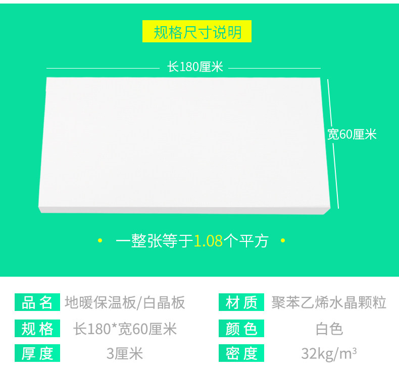 Длина теплоизоляционной платы напольного отопления составляет 1,8 метра, шириной 60 см, толщиной 3 см, а один - 1,08 квадратных метров. Если вы не понимаете, пожалуйста, проконсультируйтесь с обслуживанием клиентов.