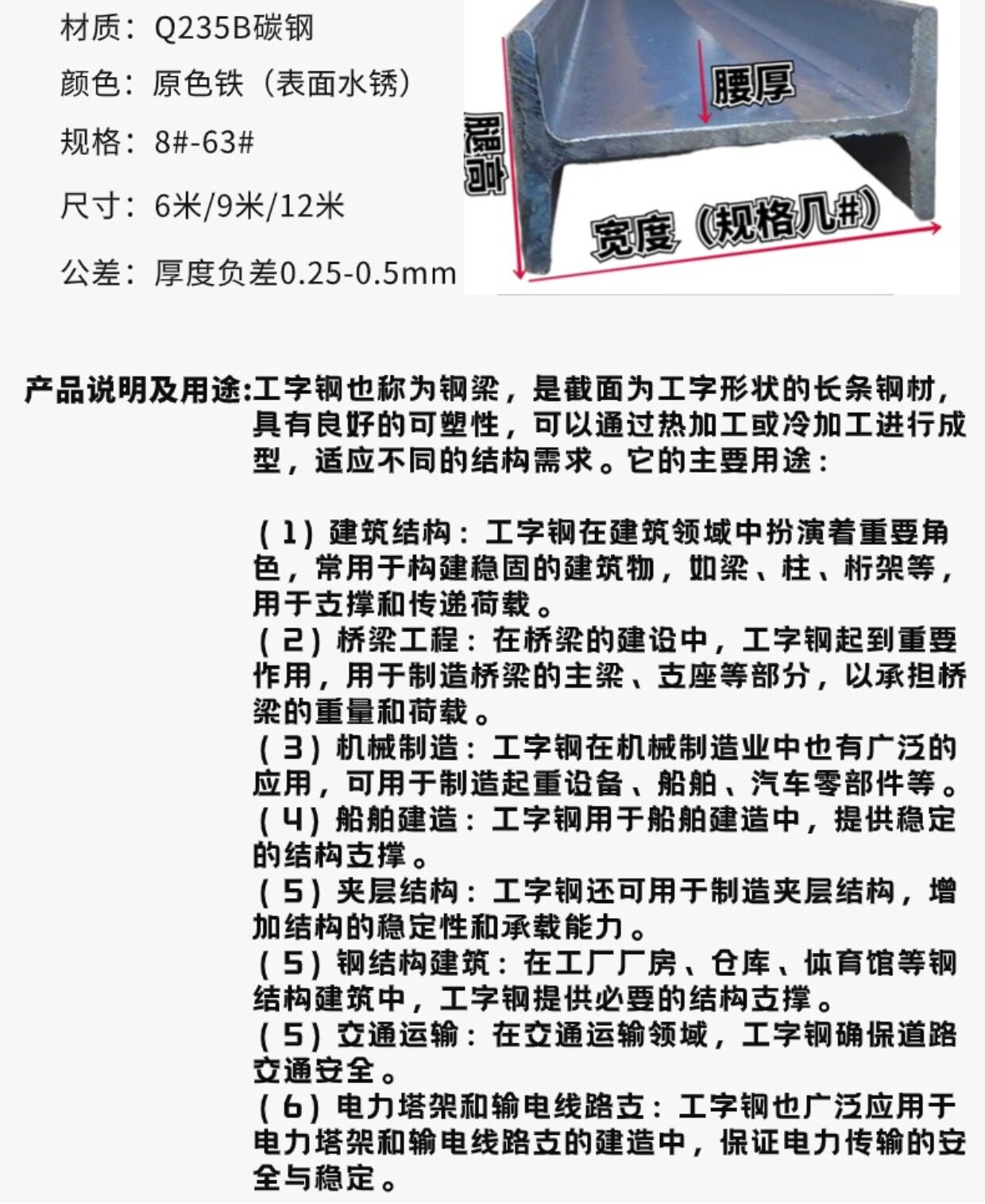 | Цвет: | Это специальная специальная фотосессия. Частная фотосессия не будет возвращена или заменена., I-образная сталь 8#【80*50*4,5 1 метра = 1 часть】, I-образная сталь 10#【100*68*4,5 1 метра = 1 часть】, I-образная сталь 12#【120*74*5 1 метра = 1 часть】, I-образная сталь 14#【140*80*5,5 1 метра = 1 часть】, I-образная сталь 16#【160*88*6 1 метр = 1 часть】, I-образная сталь 18#【180*94*6,5 1 метра = 1 часть】, I-образная сталь 20#A 【200*100*7 1 METER = 1 часть】, I-образная сталь 20#B 【200*102*9 1 METER = 1 часть】, I-образная сталь 22#a 【220*110*7,5 1 метра = 1 часть】, I-образная сталь 25#a 【250*116*8 1 метра = 1 часть】, I-образная сталь 25#B 【250*118*10 1 метр = 1 часть】, I-образная сталь 28#A 【280*112*8,5 1 метра = 1 часть】, I-образная сталь 28#B 【280*124*10,5 1 метра = 1 часть】, I-образная сталь 30#a 【300*126*9 1 метр = 1 часть】, I-образная сталь 30#C [300*130*13 1 метра = 1 часть] дополнительная толстая, I-образная сталь 32#A 【320*130*9,5 1 метра = 1 часть】, I-образная сталь 36#a 【360*136*10 1 метр = 1 часть】, I-образная сталь 36#B 【360*138*12 1 метра = 1 ветвь】 Утолщен, I-образная сталь 36#C [360*140*14 1 метра = 1 кусок] дополнительная толстая, I-образная сталь 40#a 【400*142*10,5 1 метра = 1 контакт】, I-образная сталь 45#a 【450*154*15,5 1 метра = 1 штифт】, I-образная сталь 45#C [450*154*15,5 1 метра = 1 штифт] дополнительная толстая |