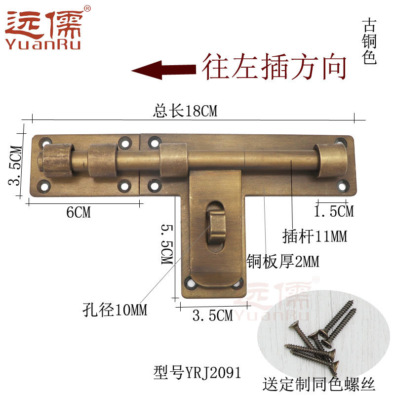 远儒 Медная резьба YRJ2091 Китайская антикварная бронзовая дверная дверь 闩 старая вставка в вставку дверей Древняя садовая дверь медная вставка