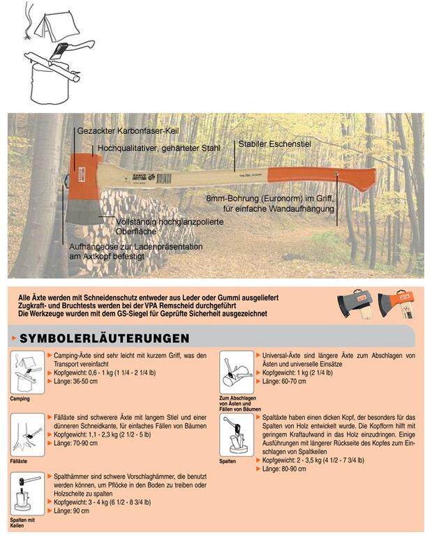 Universell einsetzbare Axt für den Heimwerker und Hobbyg&aumml; rtner. MIT Schmaler, Grosser Schneide Für einen sauberen Schnitt. GekrÜ Mmter Eschenstiel, Laceiert. Кунстстофф-Веркель. MIT Eurolochung Und 8mm-Bohrung (EuroNorm) im griff für eine einfache Wandaufhängung.