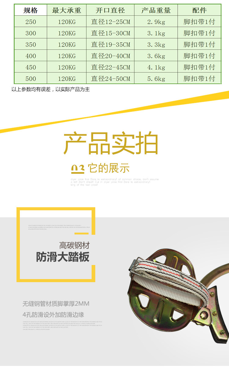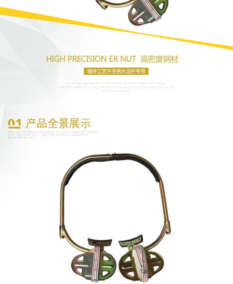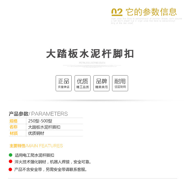 1-- Пряжка для ног: цементные стержни в основном изготовлены из точных и высококачественных материалов с пряжкой для ног и двойными ремнями сиденья забора. Это удобно, гибко, безопасно и надежно. Это хороший компаньон для электриков, чтобы иметь возможность иметь возможность работать как безопасная жизнь.Пряжка для ног: пряжка для ног подходит для высокого использования электроэнергии, почтовой и телекоммуникационной линии бетонной стержни или стальной трубной башни.СущностьИспользование пряжки для ног: подходит для электроэнергии, посадочные стержни почтовой линии.Модель номера продукта Применимого диаметра стержня (мм) Высота стержня (M) Вес (кг) Примечание JT03-01 300Φ 190-300 7-12 2.8 Переменная расстояние JT03-02 400Φ300-400 8-15 3.1