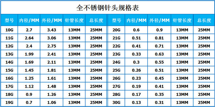 Таблица параметров спецификации иглы из нержавеющей стали: