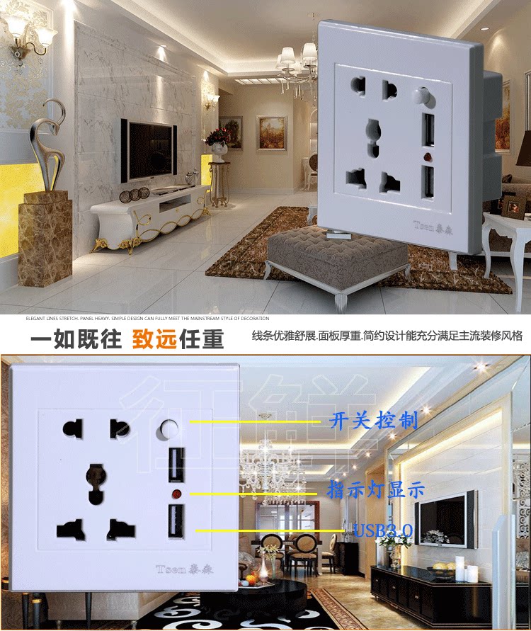 Тип 86 пять -отверстие USB -гнездо с помощью Data Cable Hotel Mobile Phone Station USB с кабелем данных 3 -IN -1 сокет