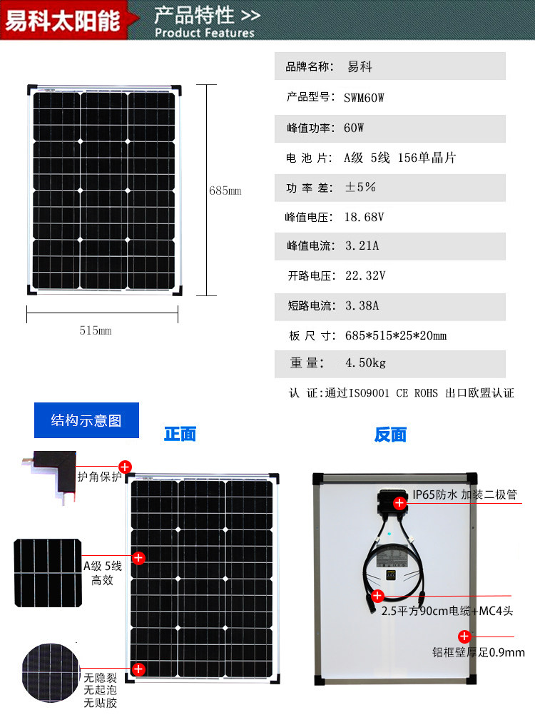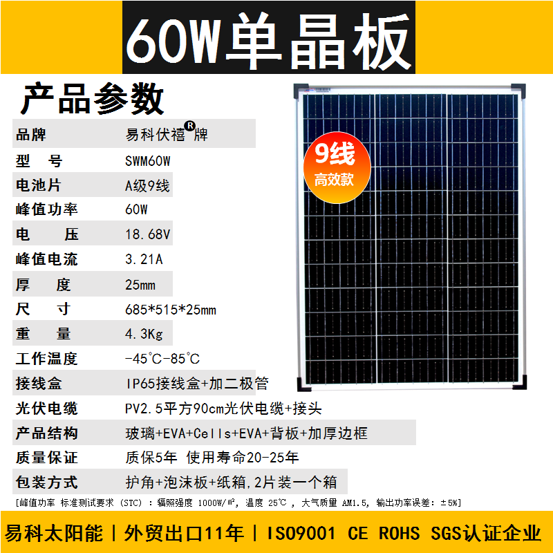 Yike 60w Solar Greneral Poyting Board, фотоэлектрическая компонент выработки электроэнергии, Портативный полевой автомобиль на солнечной плате.