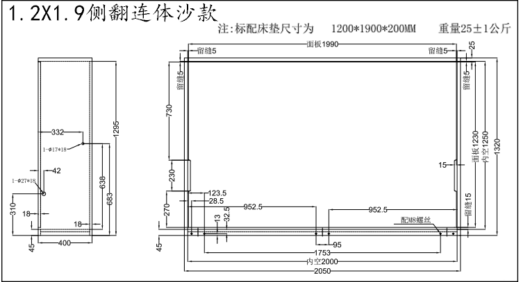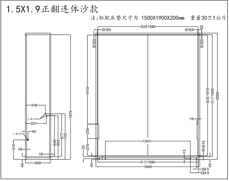- 1,5*1,9 сторона над рамой дивана для тела