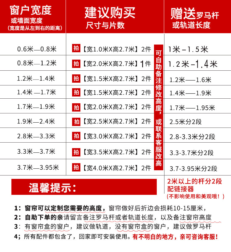 | Размер: | 1,5*2,7 высокого (короче), 2,0*2,7 высокая (короче), 2,5*2,7 высокого (короче), 2,7*2,7 высокого (короче), 3,0*2,7 высокого (короче), 3,5*2,7 высокого (короче), 4,0*2,7 высокого (бесплатно, чтобы сократить), 4,5*2,7 высокого (свободного от шорты), Один метр ткань не обрабатывается (не бесплатная доставка), 1,0*1,3 высота (специальная цена-не стержень), 1,3*1,8 высокого (специальная цена-не доставка) |