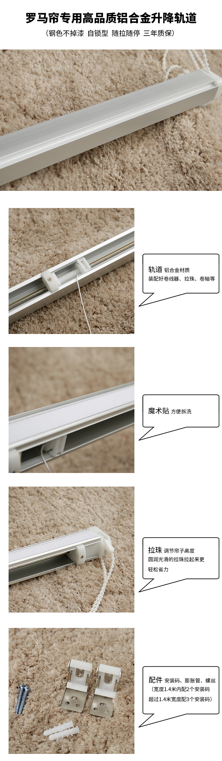 Аксессуары:Римский трек занавес, код установки, ролик, ролик (по умолчанию вправо), римский алюминиевый стержень римского занавеса (25-30 см. Интервал на передачу)