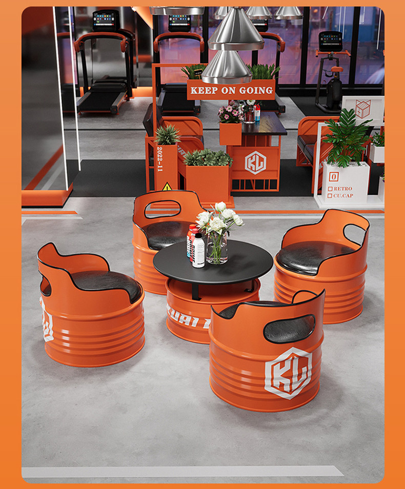 Магазин чая с молоком, сочетание стола и стула, Интернет, бар знаменитостей, тренажерный зал, зона отдыха, железная бочка с маслом, журнальный столик, стенд в индустриальном стиле, диван