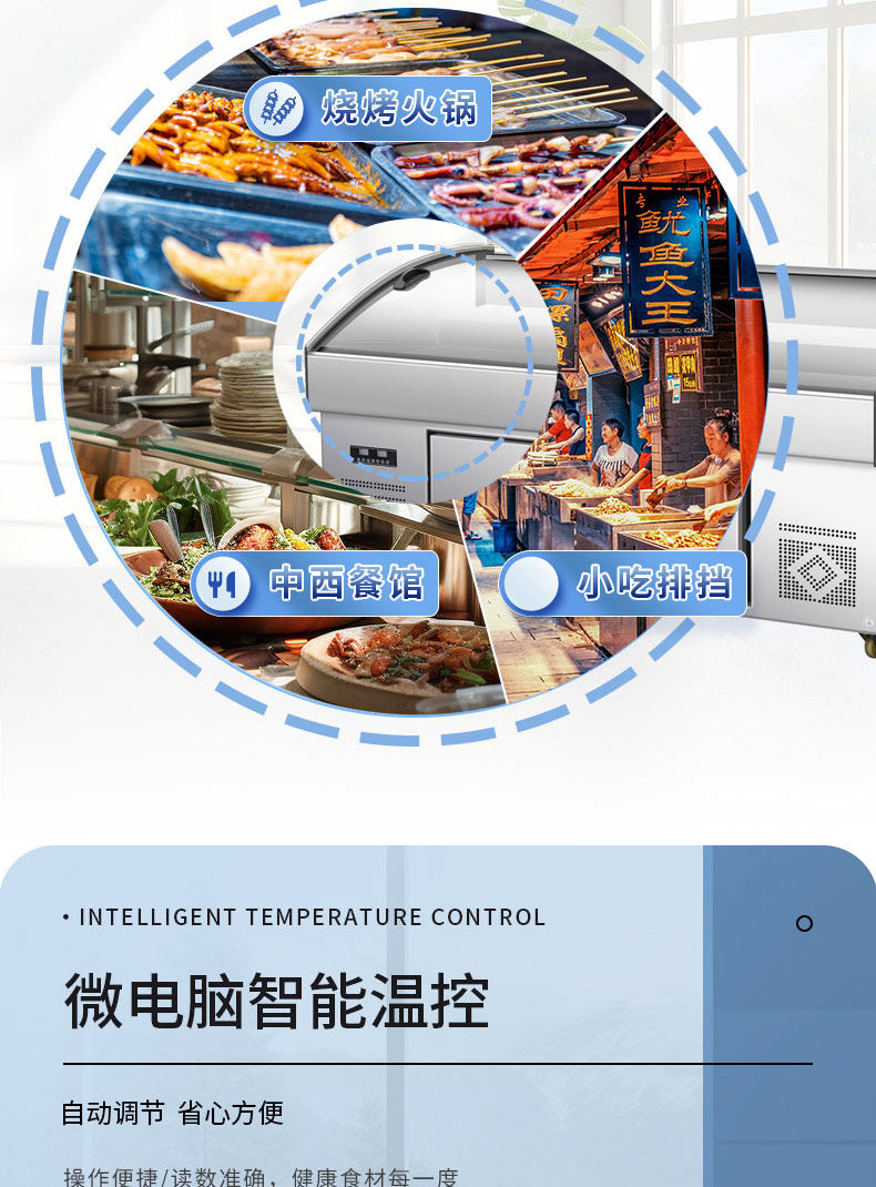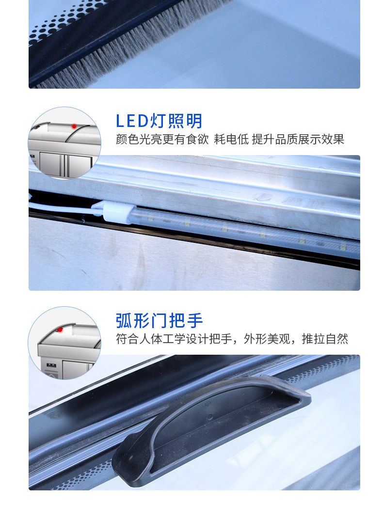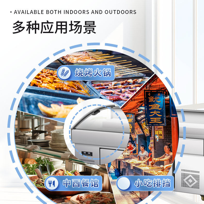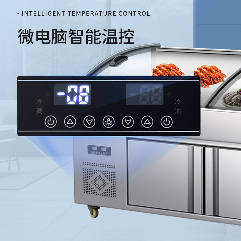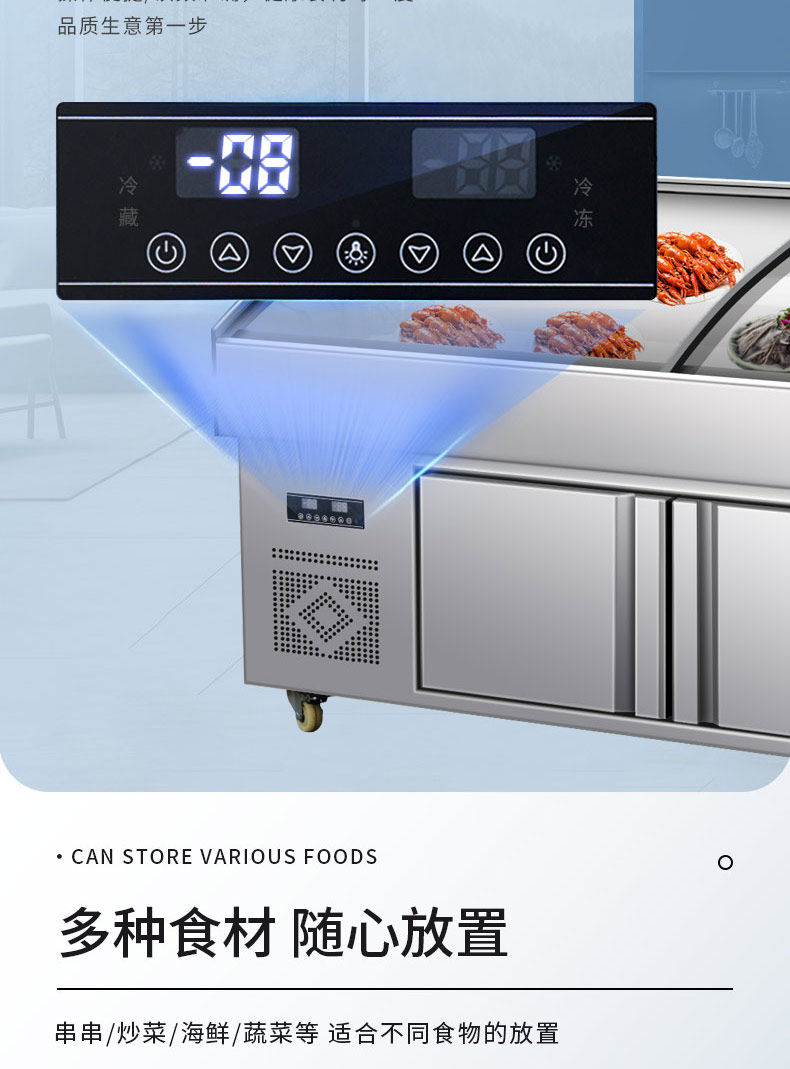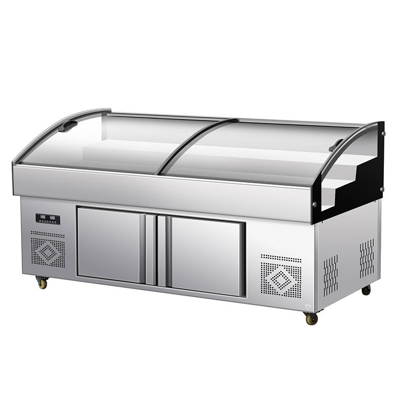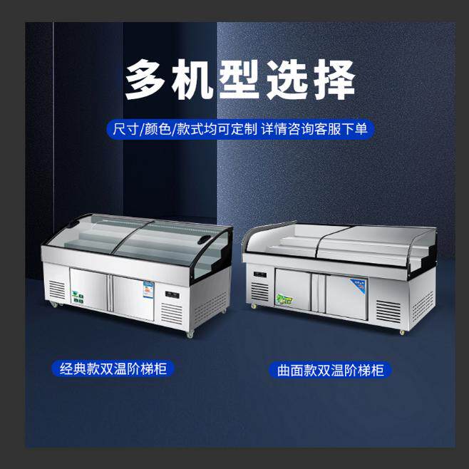 Трехъярусная витрина, холодные блюда, приготовленная еда, тушеные овощи, мясо для барбекю, коммерческий холодильник, распылительная морозильная камера, морозильная камера, ледовый стол.