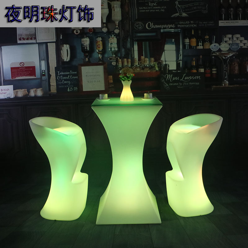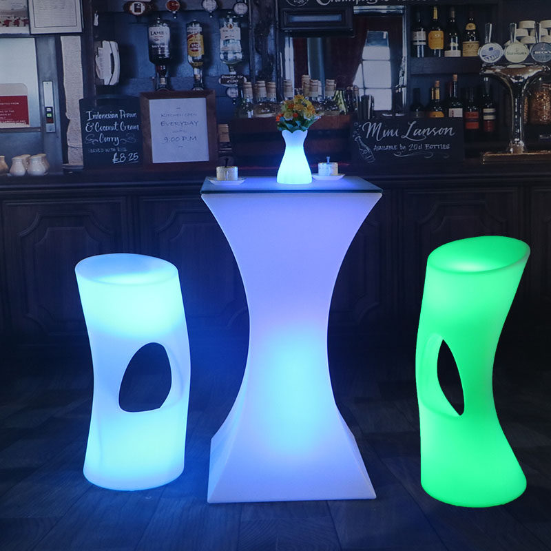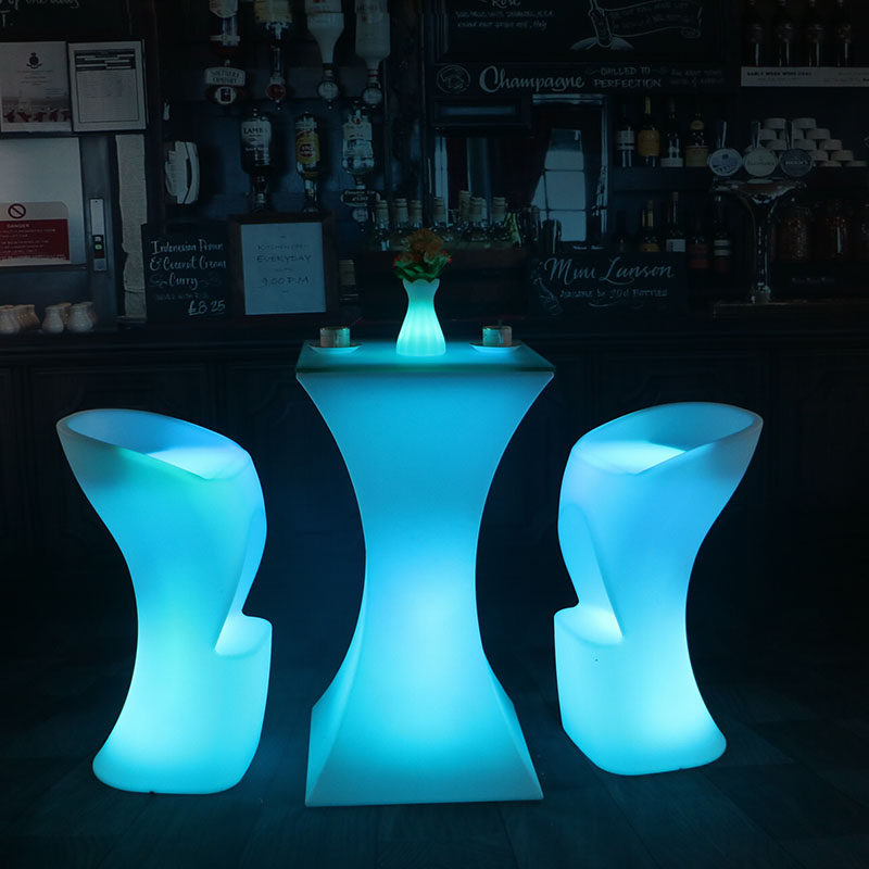 Светодиодные столовые вина, разбросанный на открытом воздухе на стол для отдыха с высокими столами с поднятыми столами и креслом для творческого стола для маленького барного стола.