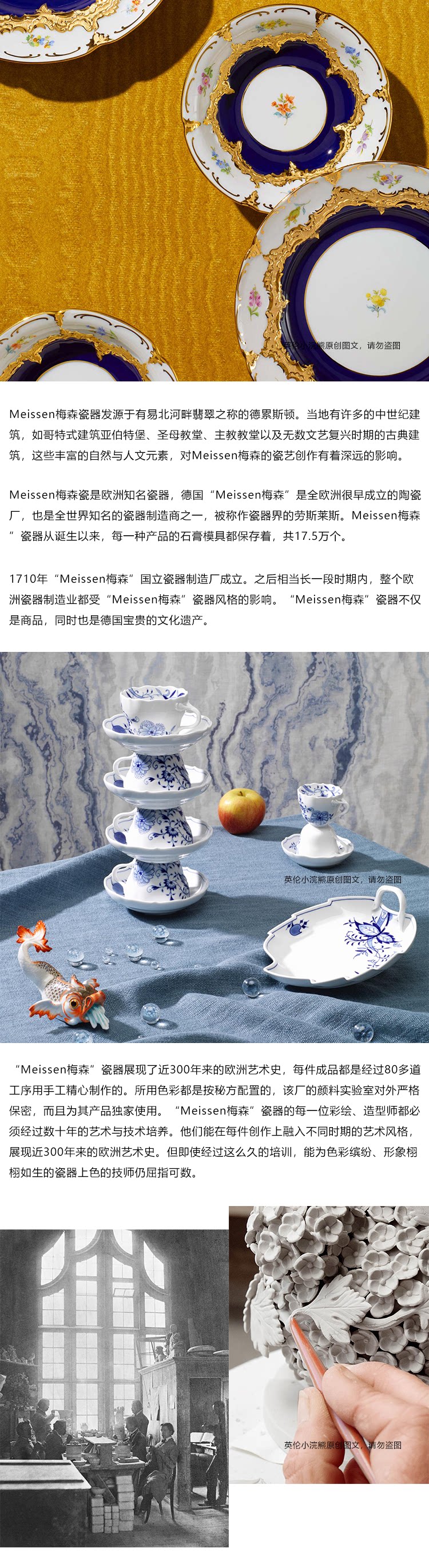 Meisssen, немецкий фарфоровый бренд с историей более 300 лет, был создан в 1710 году.Каждый фарфор фарфора Мейсена хорошо изготовлен вручную через несколько процессов. Используемый цвет настроен с помощью секретного рецепта, и каждая живопись и стилист фарфора должны развиваться десятилетиями искусства и технологий.Но даже после столь долгой тренировки есть только несколько техников, которые могут окрасить фарфор красочным и ярким фарфором.По сей день бренд по -прежнему является ценным культурным наследием в Германии.